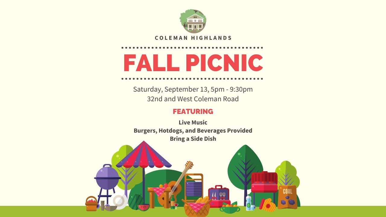 This year’s annual Fall Picnic is September 13th, 5pm – 9:30pm, at 32nd and West Coleman Rd. We’ll have a live band and will be providing hamburgers, hotdogs, and beverages — please bring a side dish! Also, we are in need of volunteers to help with setup and teardown. Please contact Amado Tamayo to volunteer and/or coordinate any items you may be able to lend for the picnic.