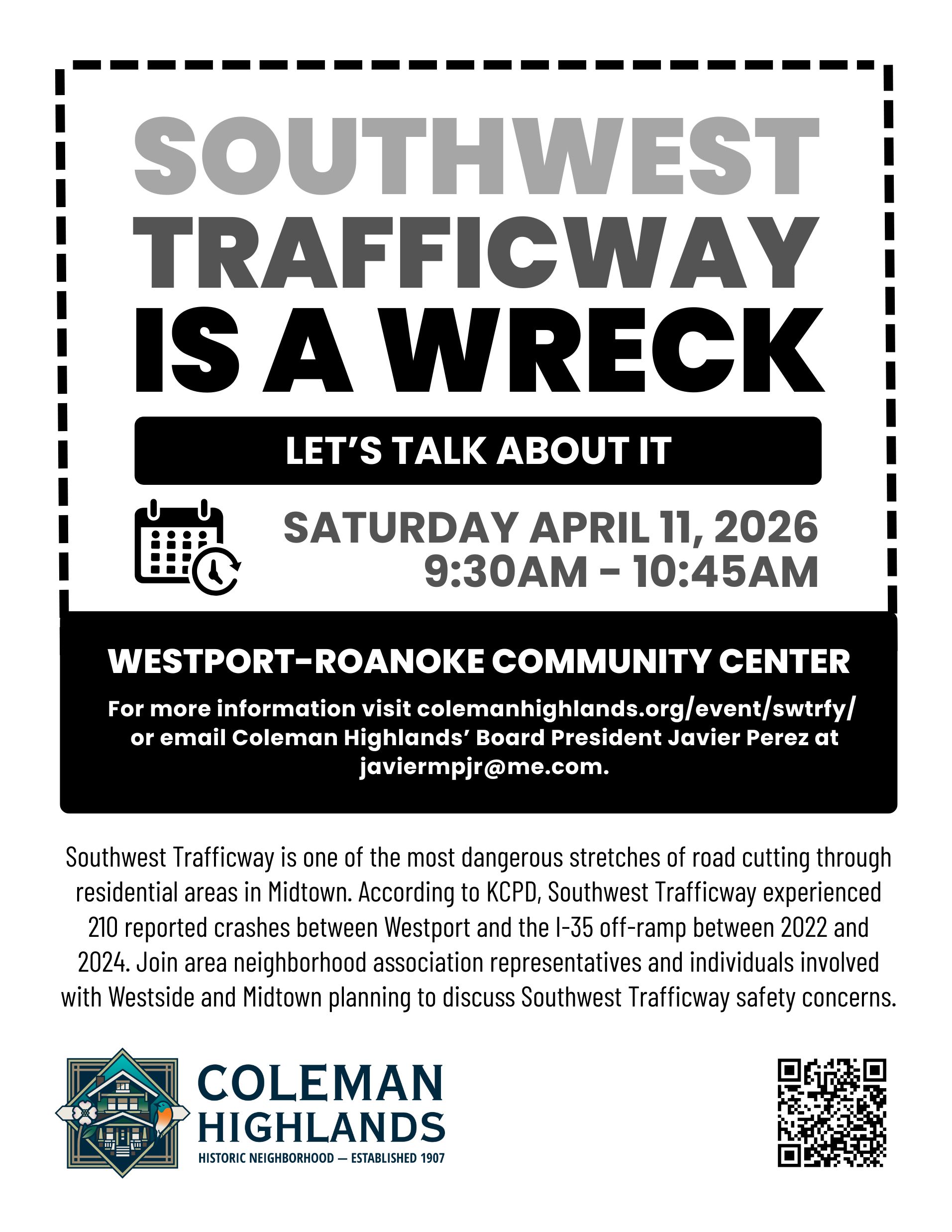Join representatives of Coleman Highlands and other area neighborhoods, as well as inidviduals involved with Midtown area planning, at 9:30am at Westport-Roanoke Community Center for a discussion about safety issues on Southwest Trafficway. Coffee and donuts will be available.