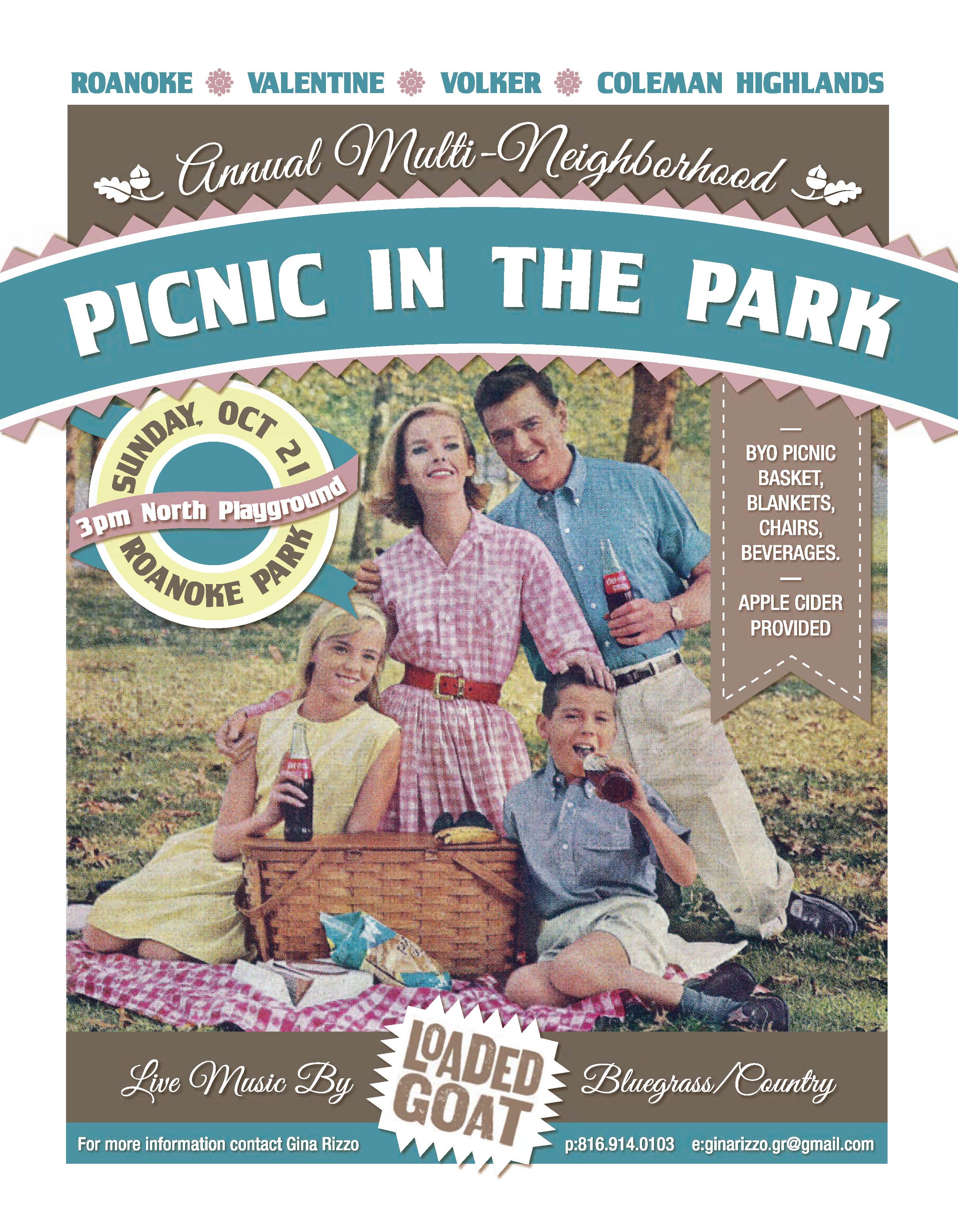 Please join us for the annual Multi-Neighborhood Picnic in Roanoke Park this Sunday, October 21! 3-5pm (or later – you can stay until sunset if you like!). Coleman Highlands is sponsoring the event this year. We’ve got Loaded Goat providing the music and we’ll also have apple cider on tap to get everyone in the the mood for the fall season! Bring your own picnic basket, blankets and chairs, and anything else you might want to drink. Feel free to bring a frisbee or some other outdoor game, too. The weather is going to be GREAT!